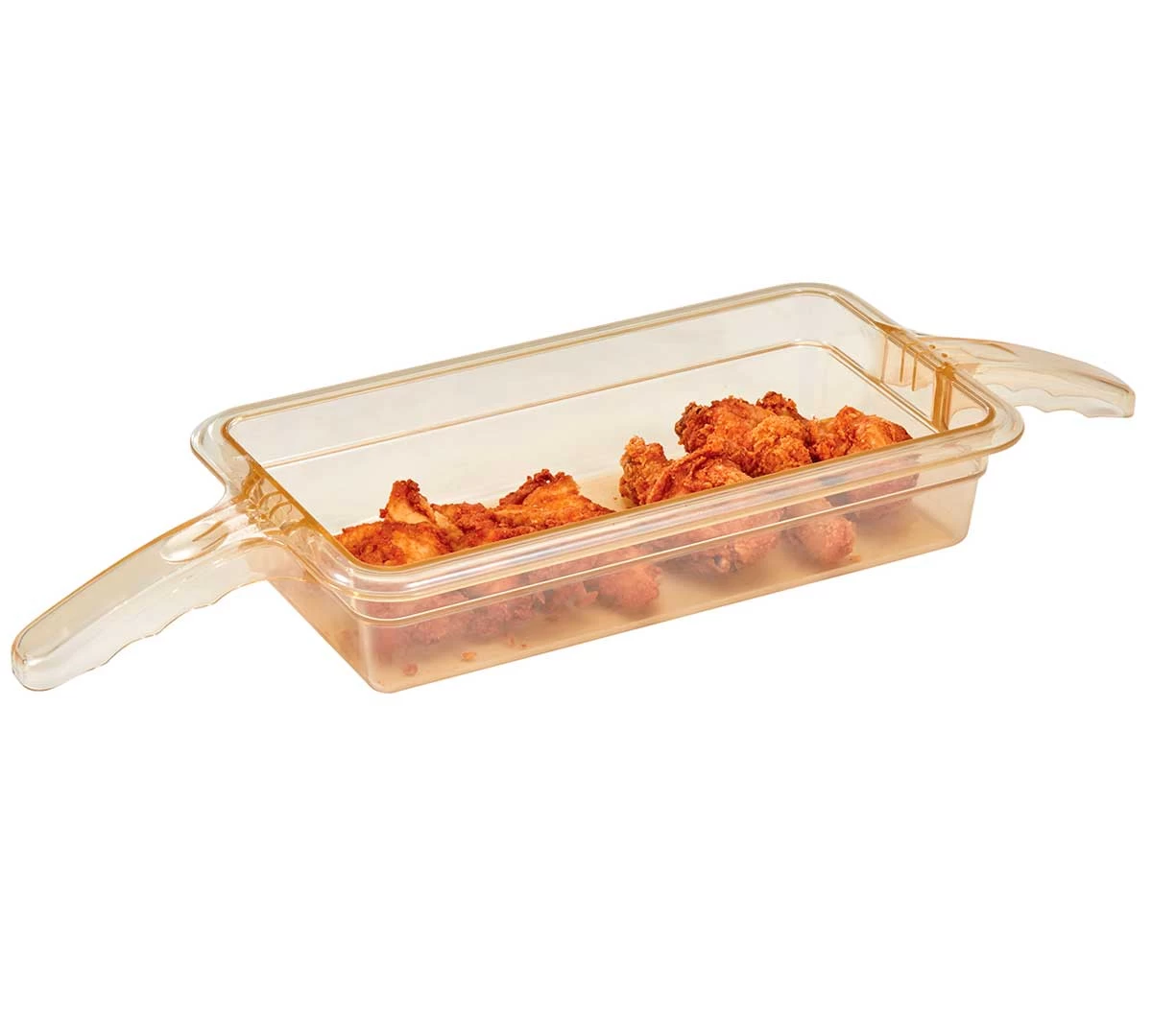 La Cubeta H-Pan Alta Temperatura con Dos Asas GN 1/3 de Cambro es de color ámbar traslúcido, está fabricada en policarbonato, un material que resiste temperaturas extremas.