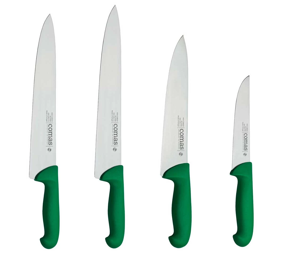 El Cuchillo Serie Carbón Verde de Comas está disponible en 4 modelos con el mango en color verde indicado para el corte de frutas y vegetales. El color permite identificarlo fácilmente y garantizar la seguridad alimentaria en la preparación de los alimentos.