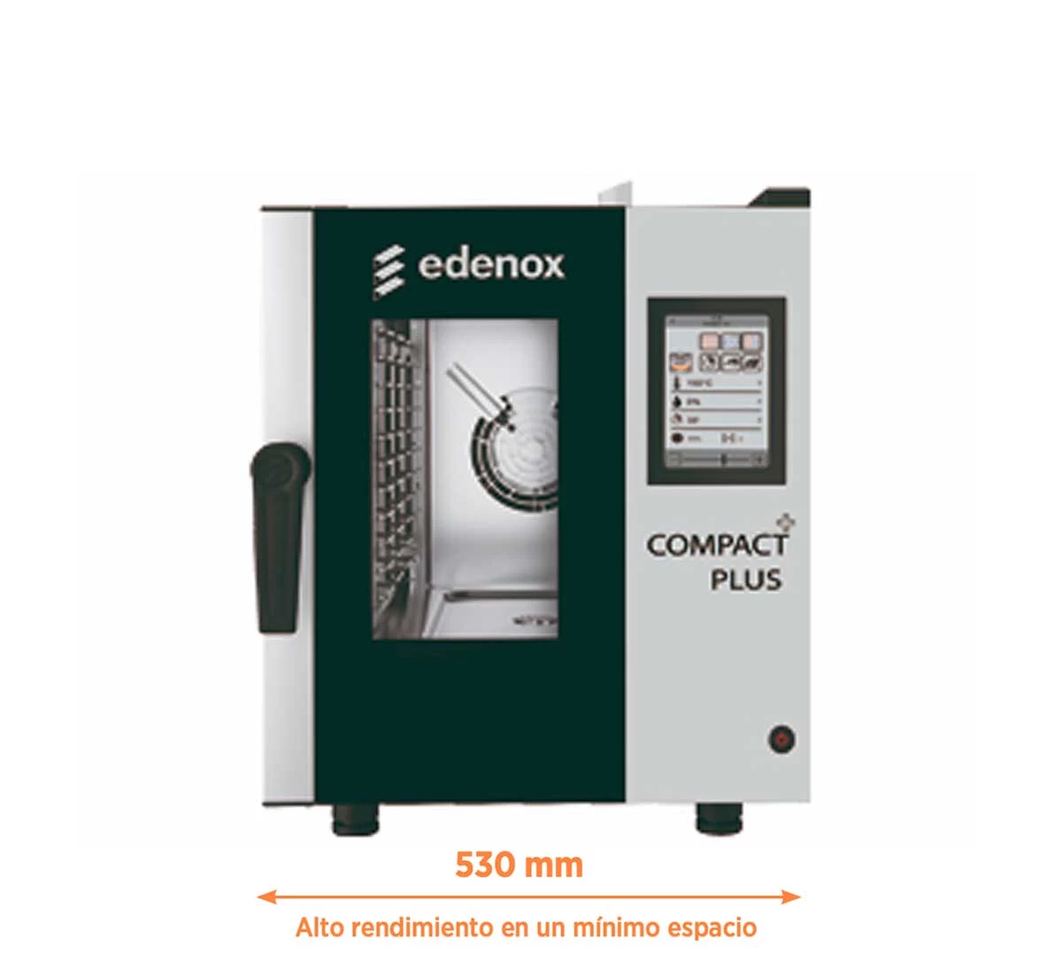 El Horno Mixto HCC 611 Digital de Edenox tiene un tamaño reducido, de 53 cm de ancho por lo que es ideal para establecimientos hosteleros que cuenten con poco espacio. La posición de la bandeja es longitudinal. Tiene una capacidad para 6 bandejas GN 1/1.