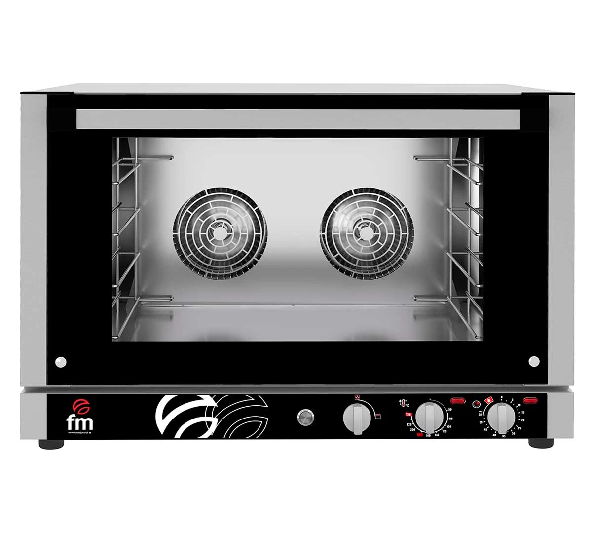 El Horno Eléctrico de convección RX 604 Plus de FM, equipado con 2 ventiladores. Tiene capacidad para 4 bandejas 60 x 40 cm o GN 1/1.