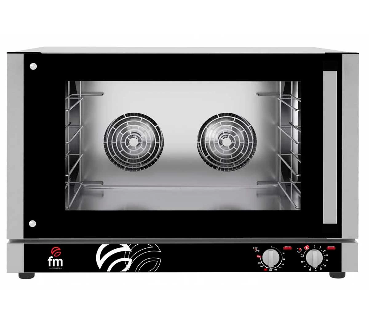 El Horno Eléctrico de convección RXL 604 Plus de FM, equipado con 2 ventiladores y puerta con apertura lateral. Tiene capacidad para 4 bandejas 60 x 40 cm o GN 1/1.