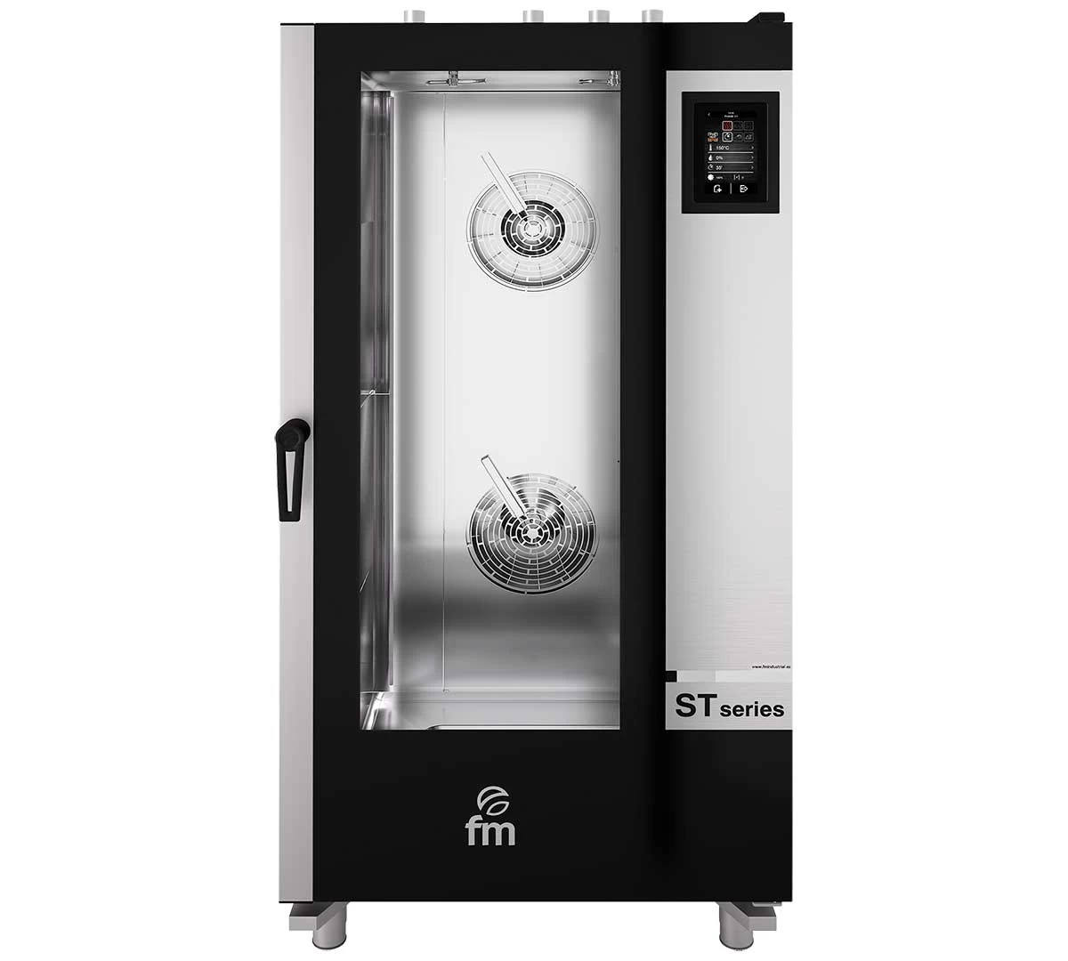 El Horno Mixto a Gas STG Gastro 201 V7 T de FM Industrial tiene panel de control digital y una capacidad para 20 bandejas GN 1/1.
