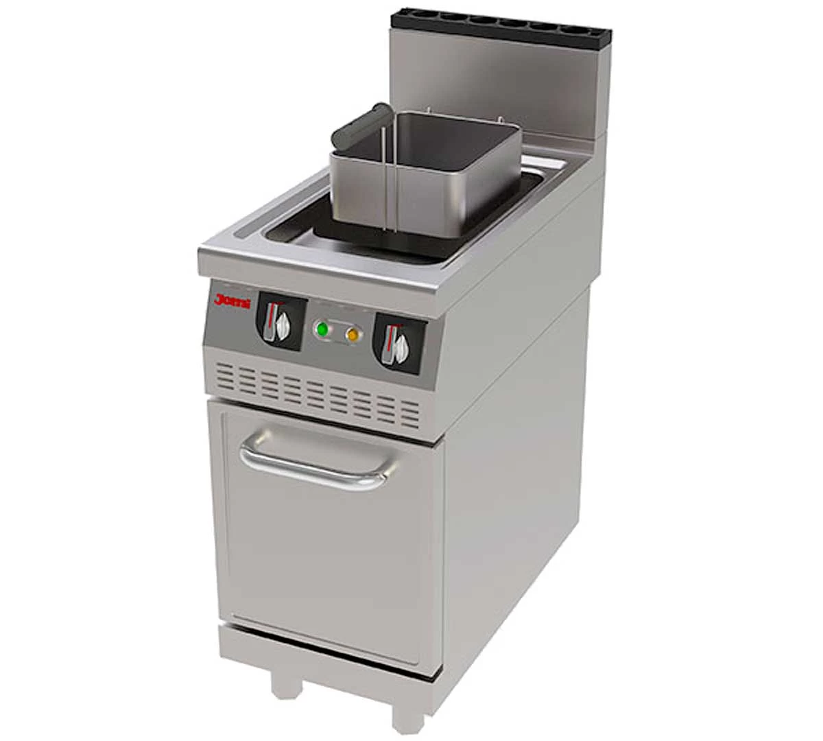 La Freidora Serie 750 EV FRG70 a Gas de Pie de Jemi, está construida en acero inoxidable con capacidad de hasta 15 litros de aceite.
