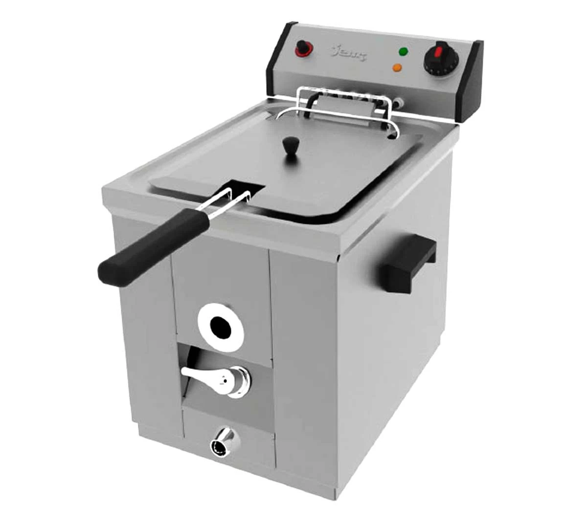 Freidora Sobremesa Serie N Agua/Aceite de Jemi, construida en acero inoxidable y provista de termostato de temperatura y temostato de seguridad.