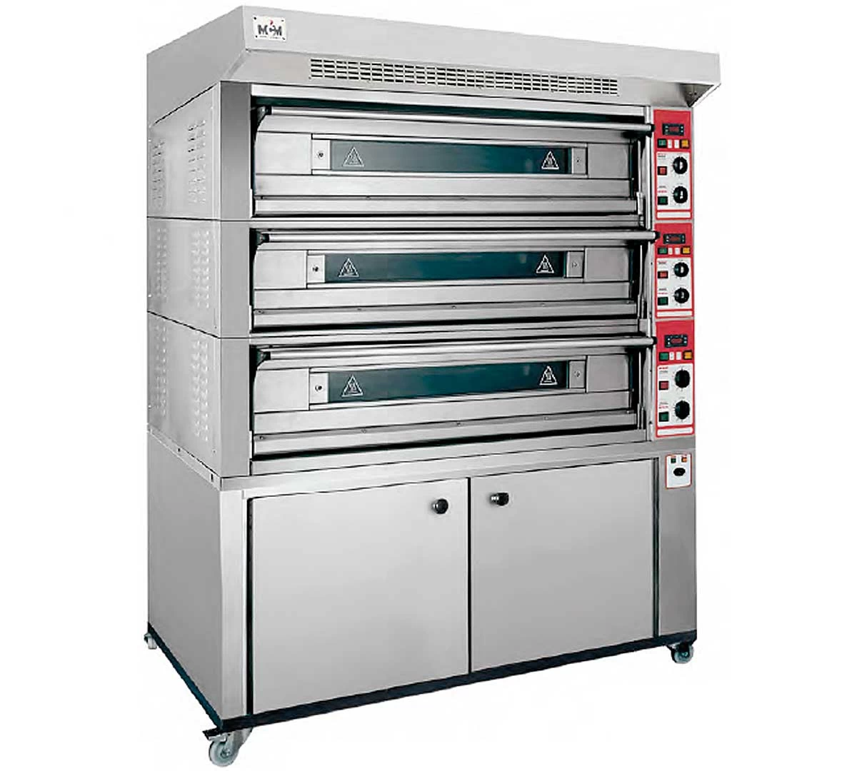 Los hornos profesionales para pizzas de MCM, están indicados para pizzerias y restaurantes con alta producción. Disponibles en 3 tamaños, para 6,12 y 18 pizzas, y con 1, 2 y 3 cámaras. En todas las versiones la regulación de las cámaras se realiza por controles electromecánicos con regulación independiente de la zona inferior y de la superior de la cámara.