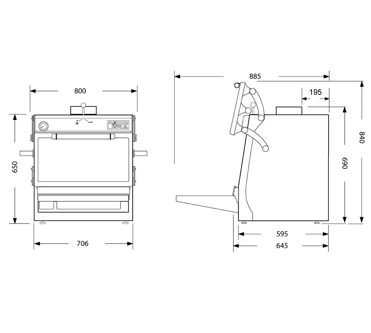 - Puerta de cristal elevable, resistente temperaturas de hasta 750 ºC. Permite ver los productos que se cocinan sin abrir la puerta, de esta forma se mantiene la temperatura constante.