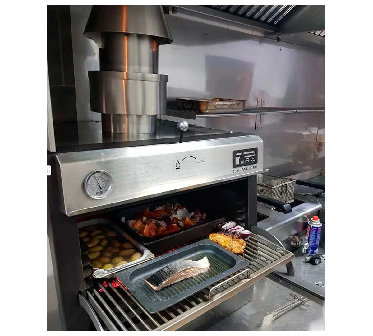 El Horno Brasa Pira 70 XL Lux es ideal para restauración. Se puede cocinar todo tipo de alimentos como pescados y verduras. Provisto de sistema de refrigeración PiraCold® para ahorrar energía y evitar la emisión de calor.
