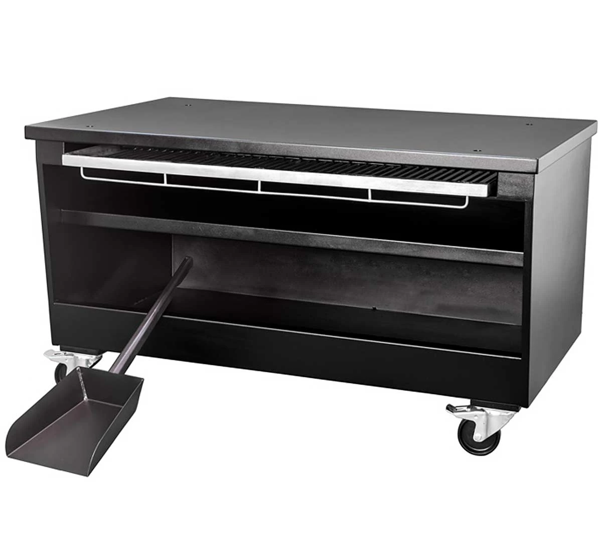 - En la parte inferior de la mesa se puede almacenar carbón de varios servicios. El habitáculo tiene forma de rampa para que el chef pueda recoger carbón con la pala carbonera Pira.