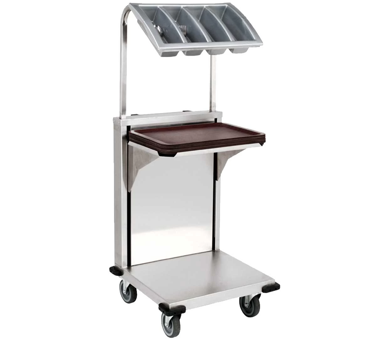 El Carro Dispensador de Bandejas D182X de Tecno Sistema está fabricado en acero inoxidable, tiene 4 ruedas giratorias y dispensador para cubiertos.