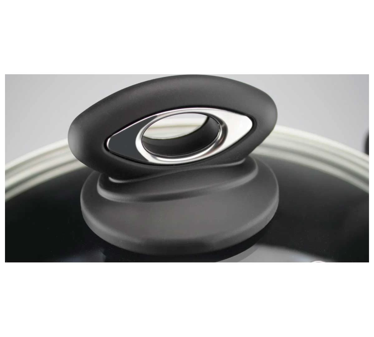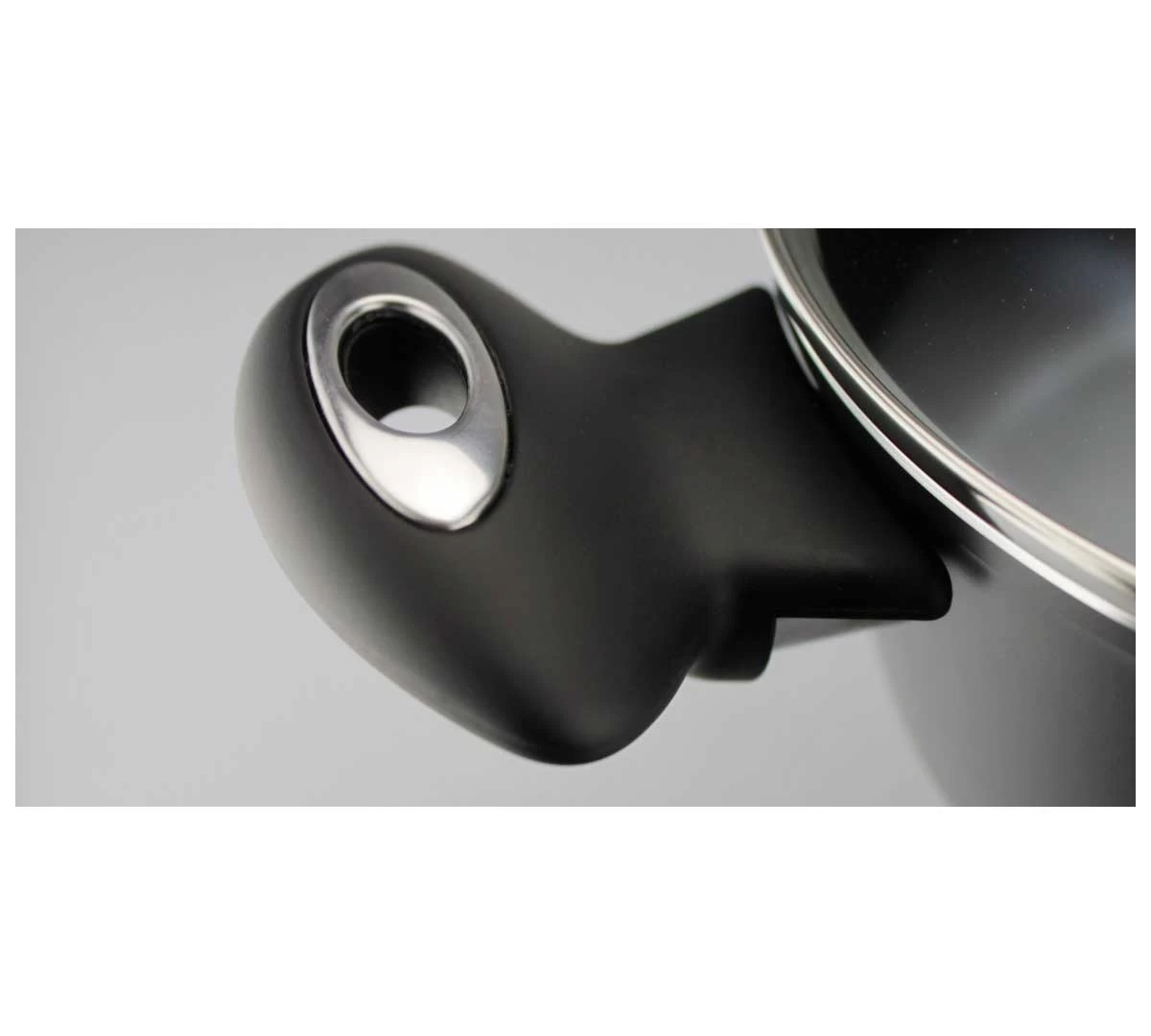 - Con asas soft-touch con diseño ergonómico y tacto agradable que permiten un agarre firme sin peligro de quemaduras facilitando la tarea en la cocina.